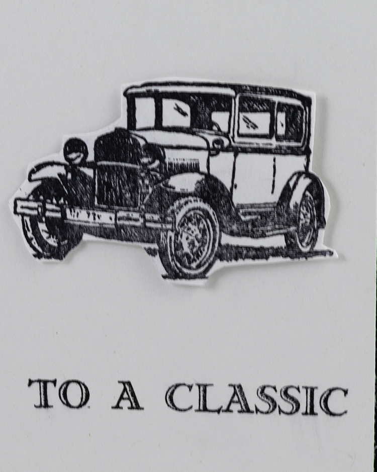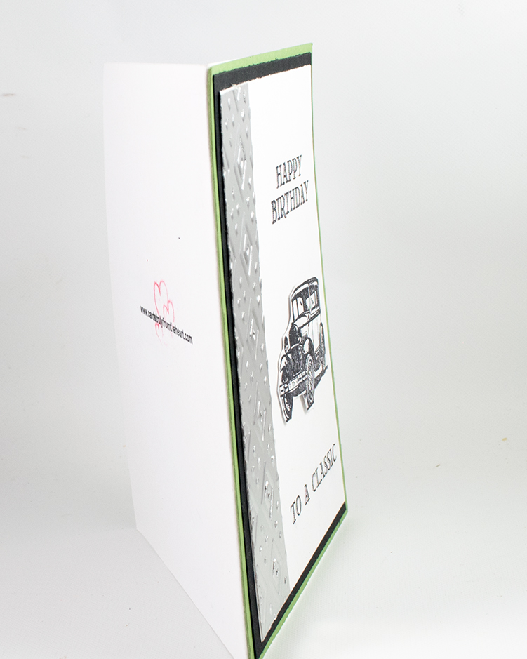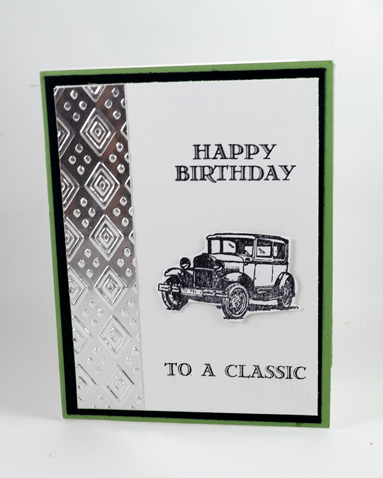 This card is truly for that car lover. An antique card decorates this card and addresses the classic lover. To celebrate their love of cars. To set up the car, I used a green background and place white card stock over it. Then I add silver embossed foil down the side. This was followed by the classic car and the greeting in between. The greeting is “Happy Birthday to a classic.”